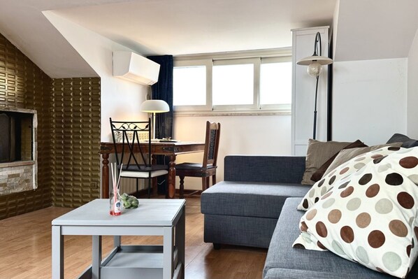 Description: fourth and last floor of small building. Entrance on living room with double sofa bed - kitchenette with table and chairs - double bedroom - second bedroom with double sofa bed - bathroom with shower box and washing machine.