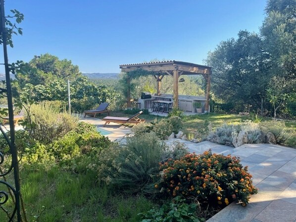 Beautiful, very spacious ground floor villa in a quiet countryside location about 10 km from Porto-Vecchio and its sumptuous beaches of Santa Giulia and Pallombagia. The villa is located in the small village of Muratello where there is a bar, a pizzeria, a grocery store selling bread, fresh fruit and vegetables, etc., a post office, not far from the Hunters' restaurant, traditional cuisine and Corsican singing evenings. Outside the villa a garden with a 10.50m x 4m swimming pool exclusively reserved for tenants. The rental has an area of 150 m2 with terraces, deckchairs, parasols and garden table and chairs so you can have lunch and dinner outside, without forgetting a magnificent breathtaking view of the countryside