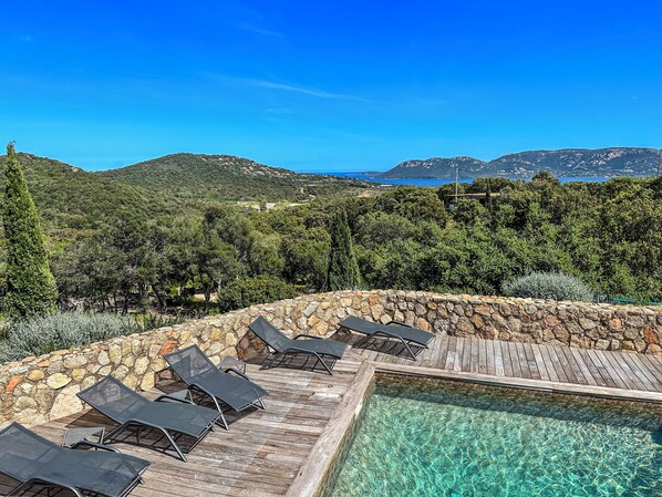 10 minutes from the beaches and 5 minutes from the city center, in the middle of a scrub planted with oaks and olive trees, our private domain offers a space of relaxation by its high standing and Luxury residence in Southern Corsica, in a quiet and comfortable setting with a breathtaking view of the gulf and the village of Porto-Vecchio.