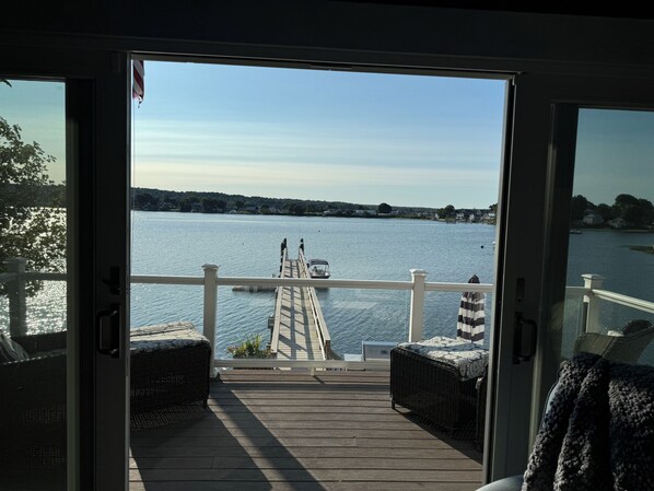The property overlooks a 125-foot dock, available upon request ($75/day), with mooring also available.