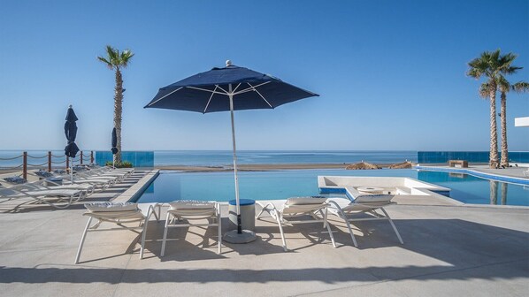 Perched above the shoreline at Encantame Towers, this one-bedroom condo offers a tranquil retreat with stylish furnishings and an expansive patio overlooking the coastline. Take advantage of beachfront amenities like a pool, palapas for shade, and chaise lounges for sunbathing.