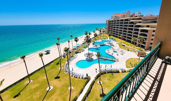Truly beautiful 2 bedroom 2 bath condo has an occupancy of 4 adults in the luxurious Sonoran Spa Resort on Sandy Beach. Here you will find everything you need for your enjoyable vacation all nicely furnished and decorated. Beautiful kitchen. Nice dining area and living room with Flat Screen TV and views out to the sea through the large double glass doors. Large Master Bedroom with access to patio area. Separate shower with 100% cotton towels. Excellent Ocean views over lush common area pool from the patio.
