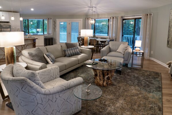 Welcome to your treehouse in the city! Perfect for Duke patients, professionals, & Durham getaways! Being nestled in a serene forest, you can relax and enjoy the sounds of nature in a quiet neighborhood very close to Duke University, Duke University Medical Center, the Duke Forest, and downtown Durham. It is also in the vicinity of the Research Triangle Park and the University of North Carolina at Chapel Hill. This property has been totally renovated and is artistically appointed. It is nestled between trees on a large lot within a quiet Duke Forest neighborhood cul de sac. A large open living area awaits you and is complete with a marble dining table that seats six. The living area is also beautifully furnished for you to watch the smart TV visit with your family, friends, or simply relax. Another section of this large room provides an additional queen sofa bed which serves as a nice reading area or an extra sleeping area. Your open kitchen is a great spot to prepare delightful meals or snacks while you visit with guests as they are comfortably seated in the living area or at the bar. Your circular great room opens to a wrap around deck with an outside table seating six. The view to the woods is fantastic, no matter where you settle. Downstairs are two newly furnished master bedrooms, one with a king bed and the other with a queen bed. Each of the master bedrooms has a full bath, and its own private patio. Like the upstairs deck, the downstairs patios are abundant with panoramic forest views. Between the two bedrooms is a small room with a twin fold out ottoman. There is also a separate laundry room with a large capacity washer and a dryer. A mesh wifi will keep you connected throughout the house. Additionally, a Ring doorbell system is in place for your safety. Parking is available in your private driveway or on the street in front of your house. Hiking is nearby on the Al Buehler Trail. We cater to guests visiting Durham and Chapel Hill, Duke patients and people with asthma and allergies, Even the most finicky would find comfort in this home!