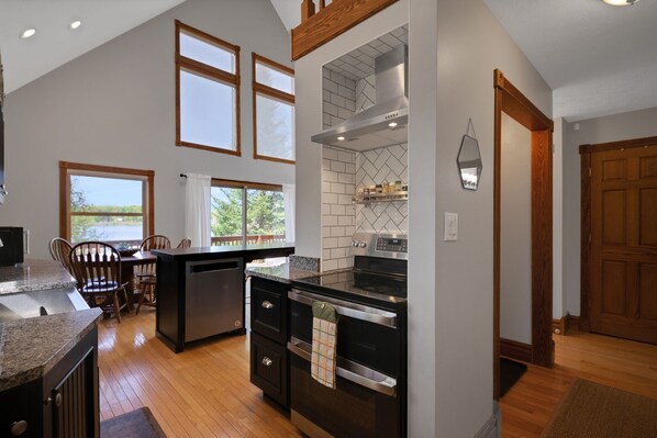 Fridge, microwave, oven, stovetop - Austin Lake Lodge : Sun, Swim, & Relax – Lakefront Lodge Sleeps 6 (Reed City)