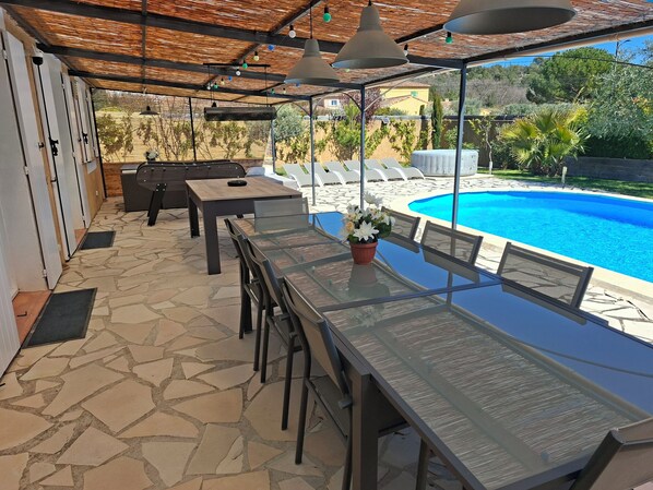 10 mins walk from the village and 20 mins from Ste Croix lake Villa 90 m2 on 700 m2, enclosed garden, swimming pool 9 x 4.5, large garage 30 m2 automatic gate, garden entirely enclosed by walls, quiet neighborhood Large living room 40 m2 with direct access to the pool, fitted kitchen 3 bedrooms, 2 of which have a view of the swimming pool, 1 of which has direct door to window Bathroom with jaccuzy bath and double sink, large separate toilet Shaded arbor 35 m2, 6 sun loungers, large terraces, parasols indoor and outdoor tables, new indoor and outdoor lounges