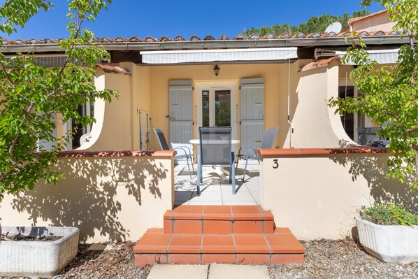 This property features a private covered terrace and access to a shared outdoor area with a pool, garden, and barbecue.