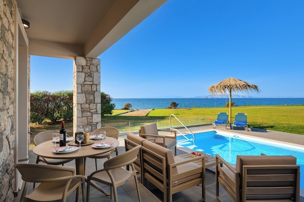 The decoration is simple, practical and comfortable. On the first floor of Diagoras Villa there are 2 fully air-conditioned bedrooms with double beds on the first floor. Also, on the ground floor there’s a comfy double sofa bed in the living room. There is a bathroom with a shower in each floor. The kitchen is fully equipped and suitable for any meal preparation and shares the space with the beautiful living room and the peaceful dining area. Guests will find a screen TV with satellite channels and free Wi-Fi access throughout the property. Outdoors, there’s an incredible private swimming pool with its sunbeds where you can relax under the Aegean sun. The sea view is quite mesmerizing and unique. Guests will have the opportunity to sit and relax at the patio and enjoy the BBQ facilities.