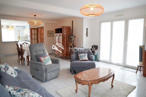 - Open-plan fitted and equipped kitchen with oven, microwave, refrigerator, dishwasher, toaster, coffee maker, and kettle.