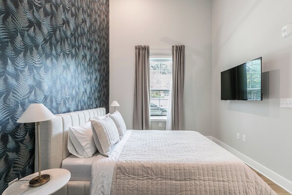 This brand new 600 square foot one-bedroom with a modern, open floorplan, comes complete with a queen-sized bed and restful queen-size pull-out sleeper sofa. Relax or work from home with free, high-speed Wi-Fi, full assortment of bath products, Leesa mattress on the main bed, and modern tiled rainfall showerhead. Your kitchen comes loaded with all pots, pans, cooking utensils and every dish you'll need. Off street compact parking space included with your stay and all other vehicles can park on the street with free, untimed parking. Enjoy two 50-inch HD Smart TVs, & fully stocked coffee bar to keep you going when you're "on the go."