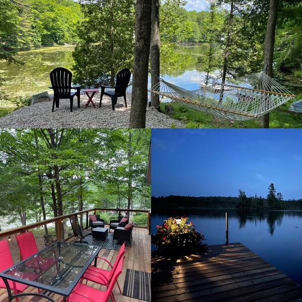 The cottage has its own dock on the Lake side of the property with Muskoka chairs for relaxing the day away.