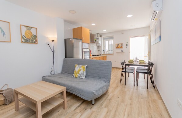 Air conditioning throughout the accommodation, free Wi-Fi, heating, TV in living room and bedroom, and an interior space of 120 m² completely renovated and designed for your comfort.