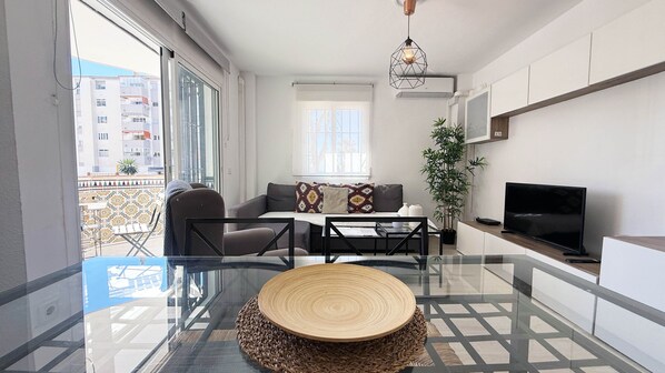 The living room is the heart of the apartment, a cozy space where you can relax watching your favorite show on the smart TV or simply enjoy the sea breeze coming through the windows. Additionally, the air conditioning ensures a cool and pleasant environment during the hottest days.
