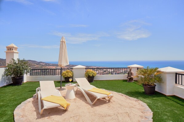 Kitchen: oven, microwave, dishwasher, toaster, ceramic hob, fridge, freezer, water tap, espresso machine, kettle, citrus juicer, laundry room: washing machine, ironing board and iron.Living/dining room: Smart TV, Netflix included, PlayStation 4, dining table, sofa-area, air conditioning, radiator, access to first floor terraceFirst floor terrace: with barbecue area, 2 high tables with 6 chairs each, low table with 4 chairs, 6 sun loungers, 2 side tables, 1 small table-fridge, ice bucket, access to upper terrace floorUpper terrace floor: area with 4 sun loungers, 2 on fine beach sand, side table, heated water jacuzzi, fridge-table, 2 outdoor chairs, ice cube trayMaster bedroom: double bed, Smart TV, air conditioning, radiator, built-in wardrobe, en-suite bathroom, access to first floor terraceTwo bathrooms: whirlpool bath, two individual washbasins, toilet, bidet, large mirror, hairdryer, heaterSecondary bedroom: double bed, auxiliary single bed, air conditioning, built-in wardrobeBathroom: shower, washbasin, toilet, mirror, hair dryer, cookerThird bedroom: double bed, air conditioning, built-in wardrobe, access to the first floor terraceSingle bedroom: single bed, access to the first floor terrace