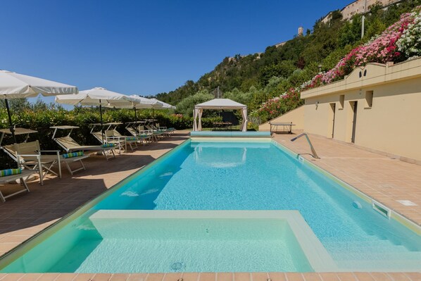 The pool has an area with 4 hydro-massage seats and, in the main pool, a hydro-massage water cannon for a pleasant neck massage.
