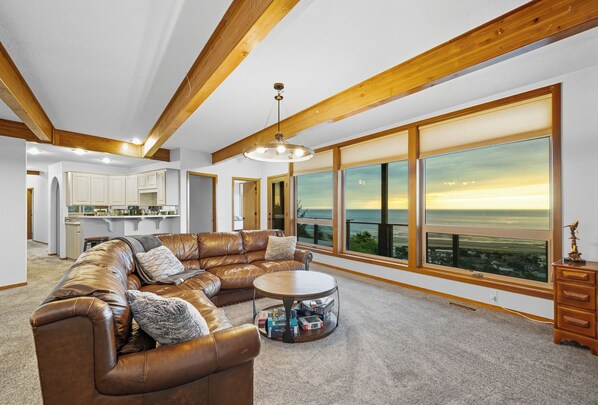 The second living area has the same ocean views and also sports an extensive board game and book collection -- enjoy a game night around the rounded leather seating and industrial modern decor. Two arcade games are offered for your gaming excitement after a n ie day at the beach. A desk by the window offers a convenient workspace with a view, and a wood-burning fireplace adds allure.
