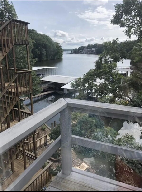 Lakeside home on mile marker 5 with 3 levels, 2 large decks, 2 living rooms, kitchen, boat dock/slip and 3 bathrooms. Sleeps 12 comfortably! The home sits at the back of a cove so there is calm water excellent for swimming off the dock. We request 25 years or older to book to stay at our house.