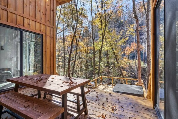 Step outside onto the expansive deck to find an inviting hot tub, where you can soak in warm waters while gazing at the starlit sky or listening to the nearby stream. The cabin's deck also boasts ample seating, making it an ideal place for outdoor dining, sipping your morning coffee, or simply enjoying the crisp mountain air.
