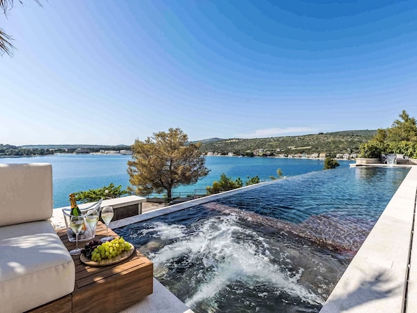 Villa "Vista I", 2 storeys, detached. Zatoglav 5 km from the centre of Rogoznica, in a quiet, sunny, elevated position, 50 m from the sea, 70 m from the beach, west facing position. For shared use: private beach, hot tub, garden furniture. Private: property 500 m2, swimming pool angular (50 m2, depth 150 cm, seasonal availability: 01.May. - 01.Oct.). Outdoor shower, terrace (15 m2), barbecue. In the house: internet access, WiFi, washing machine, tumble dryer. Parking (for 3 cars) at the house on the premises. Shop 4 km, restaurant 5 km, bakery 4 km, bus stop 1.5 km, rocky beach 180 m. Marina 5 km. 4-room villa 340 m2 on 2 levels. Beautiful and stylish furnishings: living/dining room with satellite TV (flat screen), air conditioning. Exit to the terrace, to the swimming pool. Open kitchen (oven, dishwasher, 4 ceramic glass hob hotplates, toaster, kettle, microwave, freezer, electric coffee machine). Sep. WC. Upper floor: 1 room with 1 french bed (180 cm, length 200 cm), shower/bidet/WC and satellite TV (flat screen), air conditioning. 1 room with 1 french bed (180 cm, length 200 cm), bath/shower/WC and satellite TV (flat screen), air conditioning. 1 room with 1 french bed (200 cm, length 200 cm), bath/shower/WC, double hand-basin and satellite TV (flat screen), air conditioning. Terrace 15 m2. Barbecue (portable), deck chairs (6). Beautiful view of the sea. Facilities: washing machine, safe, children's high chair, hair dryer. Internet (WiFi, free).