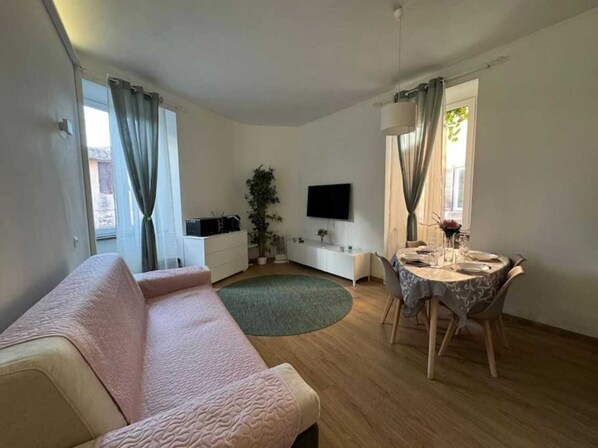The apartment features a coffee/tea maker, a TV and a kitchen with a microwave.