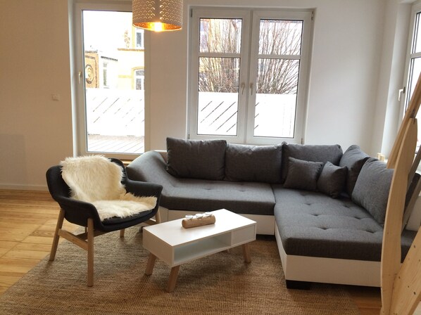 The apartment is in the 1. Floor = DG with a size of about 58 square meters is equipped for 4 people. One bedroom (with TV) with double bed, a sofa bed in the living room and 2 single beds in the loft for children. The apartment has characterful, well-kept shipboards as a floor. The large sun terrace to Friedrich-Franz-Str. invites you to a relaxing stay, reading and clapping.