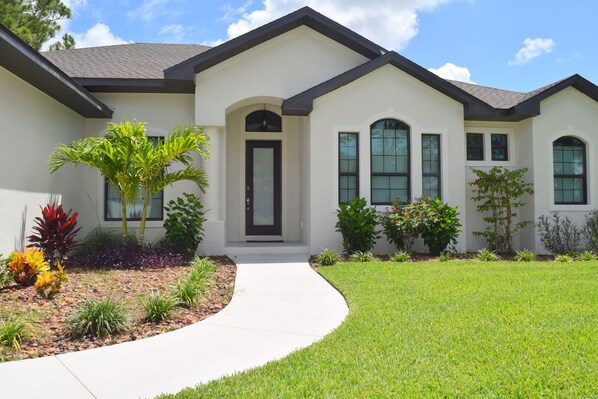 Paradise is waiting… come to this newly built single-family home located in the Pine Valley section of Rotonda West, FL! When you walk through the front door, you will feel at home. With over 2200 square foot of living space, you’ll have plenty of space to roam. This home boast 3 bedrooms, 3 bathrooms, a living room, a family room, a dining room, and a fully equipped kitchen. There are tile floors throughout the living areas, except in the bedrooms, where there is carpet. The house is set up in a split bedroom style, and an open floor plan. There are two master ensuites, which is perfect if you are traveling with another couple! Both master bedrooms have king size mattresses and a flat screen smart tv for your enjoyment. The ensuite bathrooms are both walk-in showers. The third bedroom has a queen size bed. The third bathroom is a tub/shower combo for your guest needs. Both the living room and the family room have smart TVs for your streaming pleasures. There is plenty of seating for your TV streaming entertainment with couches, love seats, and loungers. The kitchen has custom cabinetry which are stocked with your essentials for your cooking pleasures. The counter tops were upgraded to marble, with plenty of countertop space for food preparation. Stainless steel appliances, with a glass top range, dishwasher, refrigerator, and microwave. There is also a breakfast bar and stools. The dining room is equipped with seating for 6 people at a nice round table. Still need to work while on vacation? Well, you’re in luck, there is also an office space for you to set up to do your work, but hopefully not too much work!