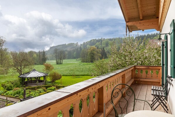 Lina is a friendly south-east apartment on the 1st floor of our house and has 90sqm, 2 bedrooms, guestclo, bathroom, kitchen and living room with access to its own balcony section overlooking the meandering stream Illach.