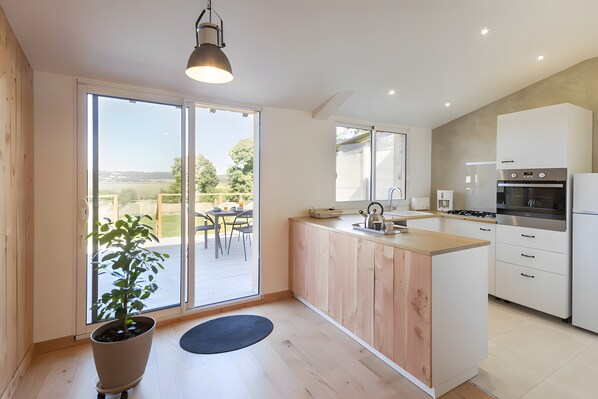 Step outside to your private uncovered terrace where you can relax while taking in views of the Vilaine River located 500 m away, along with the surrounding valley and countryside. The private garden and grill provide perfect spaces for outdoor dining and relaxation in the peaceful setting.