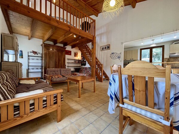 Maison de village typique. Elle comprend un séjour avec cuisine équipée (micro-ondes, congélateur, frigo, lave-vaisselle, lave-linge, plaques gaz 4 feux et four électrique), un salon ouvert sur la terrasse extérieure ensoleillée et équipée d'un salon de jardin avec barbecue, un aménagement "retour de plage" comprenant une douche et un lavabo, une salle d'eau avec bac à douche, lavabo et rangements. Un WC indépendant avec un lave-main. Une chambre avec deux couchages 140, placard et rangements, une mezzanine avec un lit 140 et des rangements, une seconde chambre avec un lit 140 et des rangements.