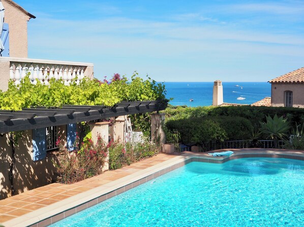 The gorgeous Villa Riviera property offering provençal-style and overlook the glorious panoramic sea view from all rooms is without a doubt the holiday home you've been dreaming of! Perfectly equipped for your stay with lovely landscaped garden approximativ 1000 sq m to appreciate the serenity of this totally relaxing place with its palm - and exotic fruit trees, provensal flowers and a big majestic pine umbrella tree, just unique for this area of French Riviera. The garden is completely fenced with swimming pool, extensive terraces, covered terrace, solarium upstairs, parking and a garage. Outside, you have enough space to enjoy the views across the ocean being especially spectacular at sunset over the Mediterranean or to settle down on the covered and cosy furnished terrace equipped with a perfect BBQ and enjoy the dinner with friends and family. Out Spa exklusive jacuzzi for five persons with beautiful sea view. You can see more pictures here: https://youtu.be/ljXcSHH93lk