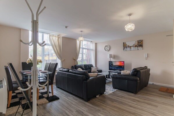 Located between central Manchester and Salford, at about 25 minutes walk in either direction, this is the perfect base to explore all that Manchester has to offer. On your doorstep there are a number of cafe's, restaurants and shops, however for more choice, Central Manchester is just a short drive or bus ride away. There is a large Sainsburys supermarket just 5 minutes from the apartment.