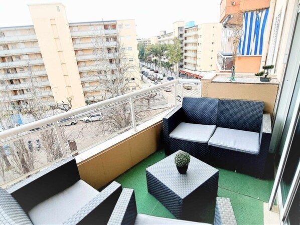 2 double bedrooms, living room with kitchenette, 1 bathroom, terrace. No pool. Located at the foot of the pedestrian street and 350 meters from the beach. 2 double bedrooms, with wardrobes. Living-dining room, with air conditioning. American kitchen. Separate laundry room. Bathroom with shower tray. Terrace overlooking green spaces. Wifi. Elevator. Area with public transport, shops, shops and restaurants (supermarket across the sidewalk). Ideal for families. Sheets, towels and final cleaning included Crib on request: 10 € per [hidden], on request: 40 € (for the whole stay).tourist tax: 1,10 €/night/person over 16 years old (during the first 7 nights).