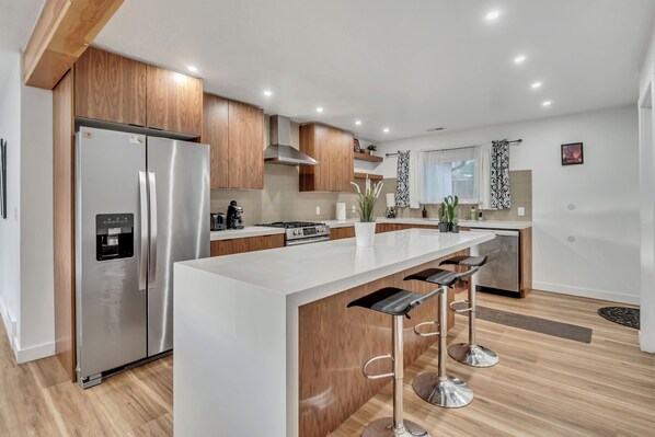 Single Level Living Dream home in Millcreek. This home has NEW everything! It was recently remodeled and 420 square feet were added to make the perfect living space. This sleek, modern style on the outside flows into the home with gorgeous Walnut Laminate floors through out, custom natural walnut cabinetry with a gas slide in range and stainless steel chimney hood. Entertain your friends or family with the oversized 9 foot island with quartz countertops and an elegant waterfall edge.