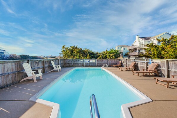 OCEANVIEW Waves - Sea Vista Dr. - The fictional KOKOMO revealed a tropical paradise in quintessential Beach Boys fashion: as a relaxing place to get away from it all. This KOKOMO lives up to the fantasy. With the ocean just three lots to the east and the sound not far to the west, this six-bedroom/five-full and two-half-bath home is perched on a rarer body of water on Hatteras Island, a lake. Enjoy the privacy this natural barrier provides as you take a dip in the 15’ x 30’ ground-level pool or drift away in an adjacent chaise lounge on the sunny patio. A covered deck provides shade for a cooler respite and adjoins a game room complete with a pool table, smart TV, refrigerator and half-bath. There is also a room with two pyramid bunks on this level with an ensuite bath that the kids will love.