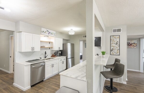 The kitchen features upgraded appliances, fully stocked with premium cookware, instant pot, coffee station, and gas stove. The kitchen also has a large dinner room table with a full bar area and is a perfect place to spend the evening with friends and family. As everyone knows, the group always gathers in the kitchen.