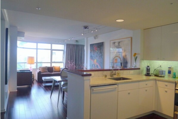 This 808 sq. ft., open floor plan condominium features dark hardwood floors all around and a re-modeled kitchen. The large living space is beautifully furnished with tasteful furniture and beauteous art works. A very special wood dining table and chairs sit in the dining area where you can enjoy your sumptuous dinner. Relax in the living room and enjoy AppleTV on the Samsung Plasma, and the Vizio Sound bar/Surround Sound.