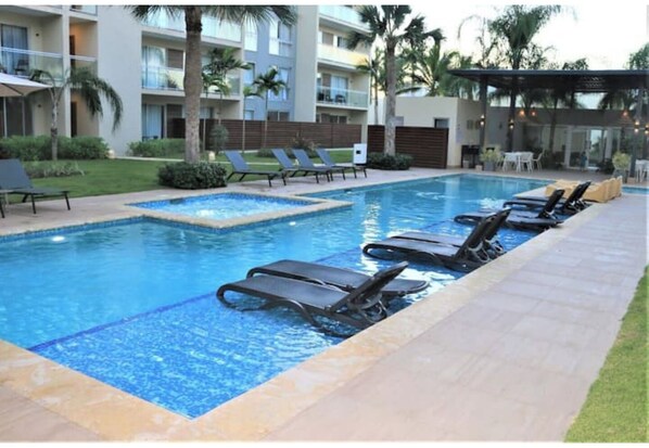 Escape to this stylish 1-bedroom apartment, nestled in a beautiful residential area with lush gardens and a pool. Relax on the private balcony or unwind in the jacuzzi, just a short walk from the beach.