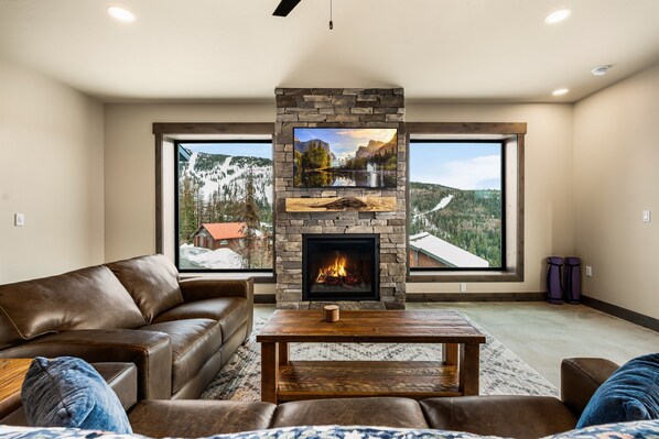 The third floor is one large great room for hanging with your crew. You will love the open modern kitchen with all new stainless appliances (gas range / oven), dining table that comfortably seats 8, Italian leather sofas around the gas fireplace, 55-inch TV with free high speed wifi, private hot tub with views of the mountain and forest, a gas barbecue, and yoga matts to help stretch out after skiing. All the wood furniture was custom built by our friends at Misty Mountain Furniture in Sandpoint.