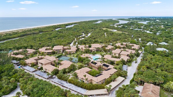 Blind Pass Condos at Bowman's Beach F204: You've found the perfect spot for your birding or beach vacation! This weekly rental is beautifully appointed and has everything to make your stay an absolute delight. The unit is a two-bedroom, two-story 2.5 bath townhouse condominium that overlooks the lush tropical grounds of one of Sanibel's most family-friendly destinations. The main level features the kitchen, living and dining room, a half-bath, laundry area, and screened lanai, while the primary and guest bedroom and baths are located upstairs on the second floor. A short stroll through Bowman's Beach Park or across our footbridge over Clam Bayou leads you to the most pristine and expansive stretch of beach on Sanibel. Shelling, fishing, swimming, and sunbathing abound! Unit F204 is 355 yards / 6-minute walk to the beach. Blind Pass features an outdoor heated pool, two tennis courts with pickleball court (paddles provided), a clubhouse with wi-fi, grills, complimentary kayaks, and covered parking.