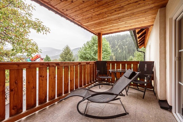 This small but fine resort on the Kreischberg is a very special oasis of well-being with its 5 holiday apartments and its 10,000 m² property. The centuries-old, traditional farm has been redesigned and modernized with great attention to detail. The extensive green area invites you to sunbathe, observe nature and play. The 3 fish ponds are also an absolute highlight, on whose banks you can sit back and relax. The in-house, covered barbecue area is perfect for culinary hours in convivial company. Our youngest guests can let off steam in the playground, whose swings and climbing house with slide are sure to delight the little ones. The resort also has a ski room and a laundry room. Another highlight: ponies and alpacas to pet (on request) The 85 m² holiday apartment can accommodate up to 6 people. The apartment has 2 beautiful bedrooms with double beds, and there is also a sofa bed in the living area. The bathroom has a shower. The open kitchen in the apartment is fully equipped: cutlery and (cooking) dishes are available, a ceramic hob, oven, dishwasher and a fridge with freezer compartment are also included, as are a toaster, kettle and a Nespresso coffee machine. A small starter set with dishwasher tablets, dishwashing liquid (sample), sponge, garbage bag, cleaning cloth and tea towel is ready for you on arrival. WiFi is free, satellite TV.