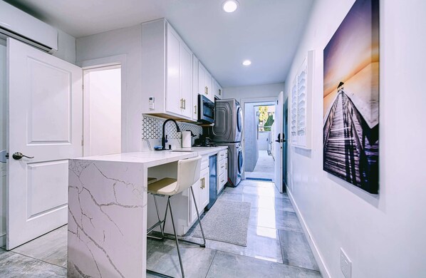As you enter, you'll find marble flooring and a comfy red sofa for relaxation. You'll have access to our fast Wi-Fi, with speeds of 1000Mbps down and 20-50Mbps up. This unique space is a tiny home garage within a private complex, thoughtfully equipped with brand-new appliances and a generous 55" Smart TV. It's the perfect haven for travelers eager to explore the beauty of Orange County. Should you desire shopping or dining, a conveniently located shopping center is just down the street.