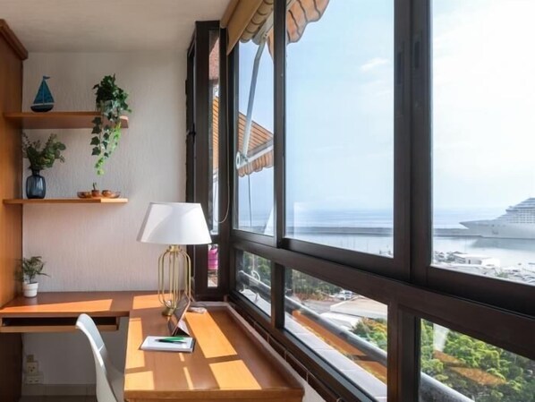 It is a large apartment that consists of a very large main room that houses the living room and dining room, a sliding glass door separates this room from a porch converted into a study with a generous desk and its corresponding office chair, located in front of the large windows. . From this height, it enjoys wonderful views of the sea, the port of Santa Cruz and the city.