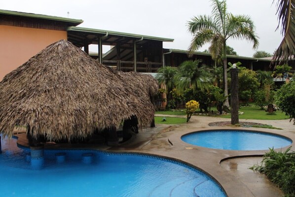 Travelers find a refreshing escape at the swim-up bar and outdoor pool, surrounded by gardens that create a peaceful retreat for enjoying local cuisine.