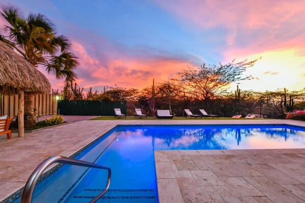 Located in Aruba, this beautiful home offers a peaceful oasis with a completely private pool surrounded by nature. Enjoy the picturesque sunset from your own saltwater pool, perfect for relaxation and spending time with family and friends.