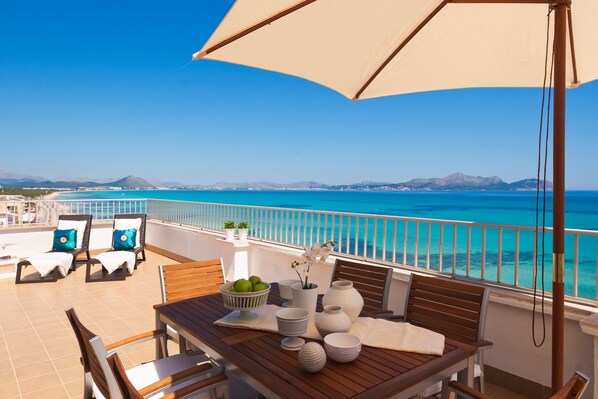 The Bahia Vista apartment is located on the seventh floor (with elevator) on the first line of Can Picafort beach. From the huge roof terrace, which is exclusively available to you, you can enjoy a spectacular view over the entire Bay of Alcudia. There are a total of 3 bedrooms and 2 bathrooms available.Two of the bedrooms are double bedrooms, one of which has an en suite bathroom. A third bedroom is equipped with a bunk bed for 2 children, so that a total of up to 5 people, as well as a baby in a cot, can be accommodated there. The apartment is stocked with all kinds of towels, for the kitchen, the bathrooms and also for the beach. A cot and high chair can be provided free of charge upon request.
