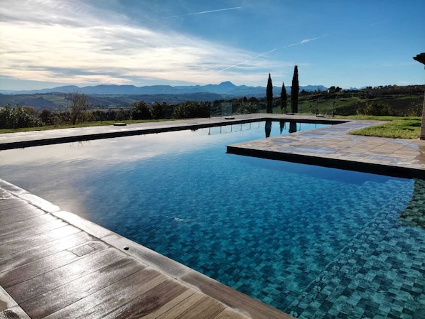 Outdoor pool, pool loungers - Villa Vernaschi "Certain places become much more than destinations for a trip." (Santa Maria Nuova AN)