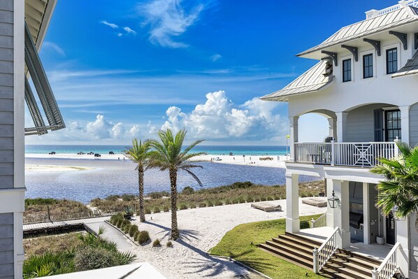 Perched near the shimmering shoreline of Grayton Beach, Down By The Sea is a cheerfully refreshed four-bedroom, four-bath coastal retreat designed for relaxed gatherings and memorable beach vacations. Welcoming up to fourteen guests, the home captures the charm of classic 30A living with beautiful Gulf views from the columned front porch and breezy upper balcony. From these inviting outdoor spaces, you can take in the rare sight of Western Lake meeting the Gulf—one of the world’s few coastal dune lakes—while enjoying gentle sea breezes and peaceful coastal scenery.
