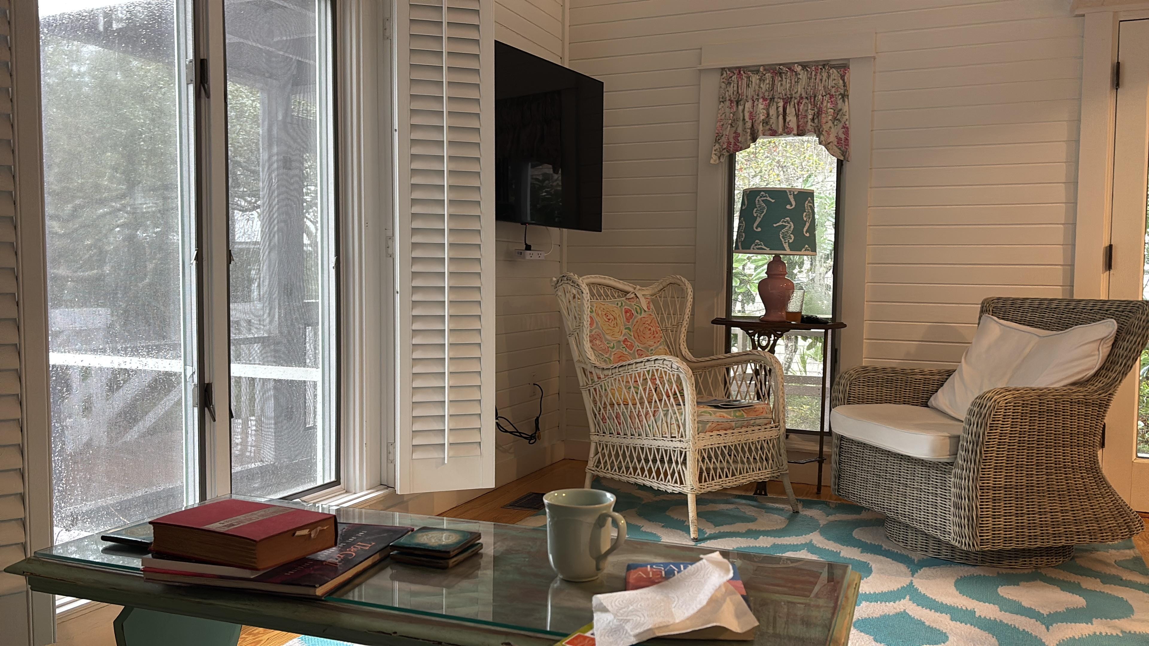 Rosewalk Park, located just behind the home, is one of Seaside’s hidden gems, with sandy footpaths and shaded green space that create a quiet escape for both kids and adults. The home’s screened rear porch overlooks the park and features bar-top seating for two and a porch swing—an ideal spot for morning coffee or winding down in the evening.