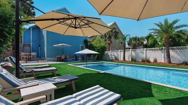 Blue Pineapple is a stunning 4-bedroom beach retreat nestled in the serene Seagrove community, Village of Sugar Sands. Step into a backyard oasis featuring a brand-new heated saltwater pool, lush tropical landscaping, and soft turf, perfect for relaxing or entertaining. As you arrive, simply turn left at the front steps and follow the charming porch, where six beach chairs await, ready for your beach adventures. With just a two-minute walk to the shoreline and space to comfortably sleep 11 guests, this home promises the perfect getaway for families and friends.