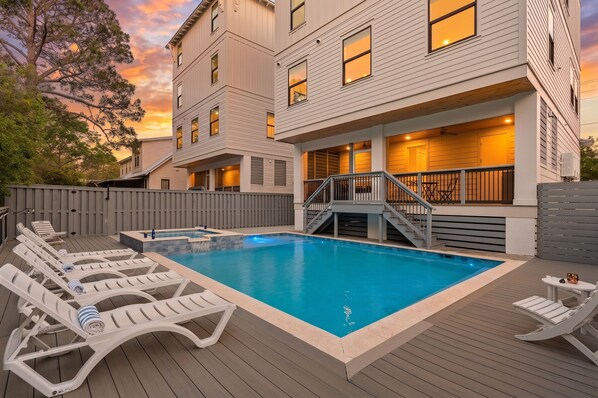 Outside, the pool and spa anchor long afternoons, with the spa offering a warm spot to unwind as the evening settles in. The screened porch sets the scene for al fresco dinners off the built-in outdoor kitchen and grill, with a 6-seat table, bistro set, and overhead fans keeping things easy. Getting around is effortless with a complimentary 6-passenger low-speed vehicle and eleven adult bikes at the group's disposal—plus access to the free Grayton Central shuttle just a short walk away, making the beach a two-block trip.