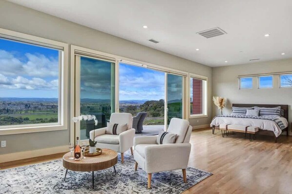 Perched atop a hill, the Sunset House offers breathtaking vineyard views and unparalleled sunsets. This elegant home features 6 bedrooms and 5 baths (5 bedrooms in the main house and a separate 1-bedroom, 1-bath ADU) providing a blend of rustic charm and modern luxury. With spacious living areas, a gourmet kitchen, and multiple outdoor spaces, including a private hot tub and fire pits, the Sunset House is ideal for relaxation and entertainment.